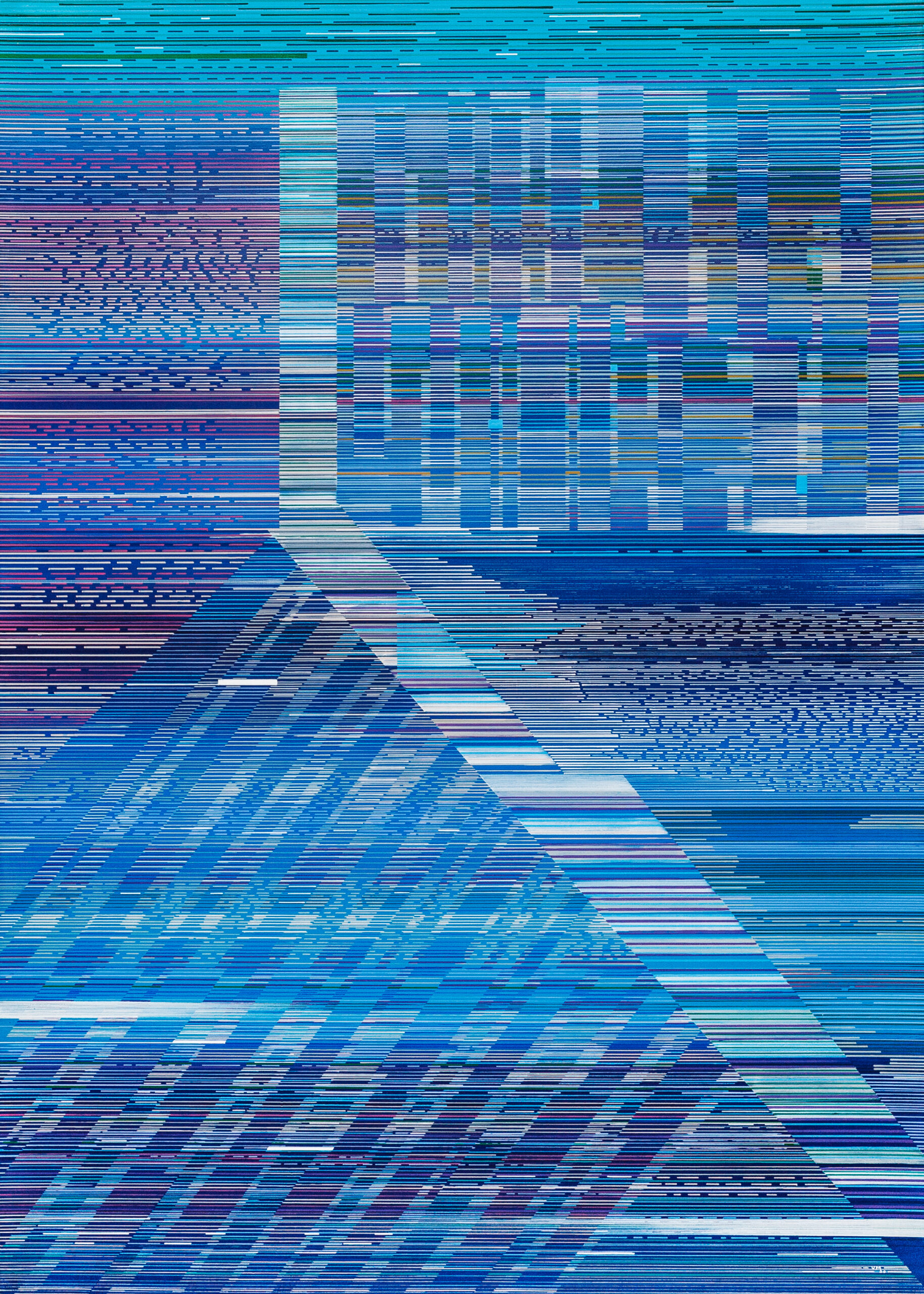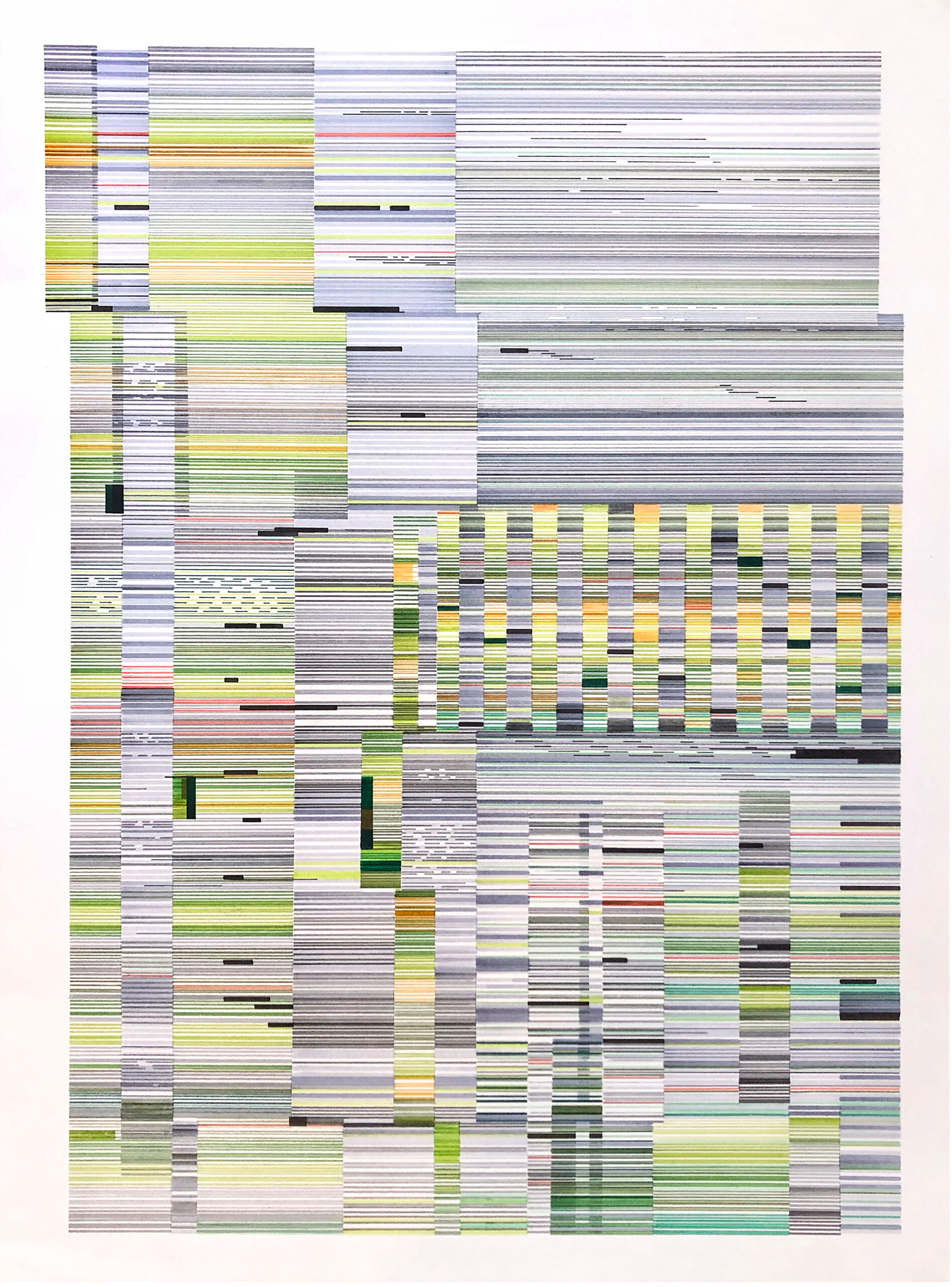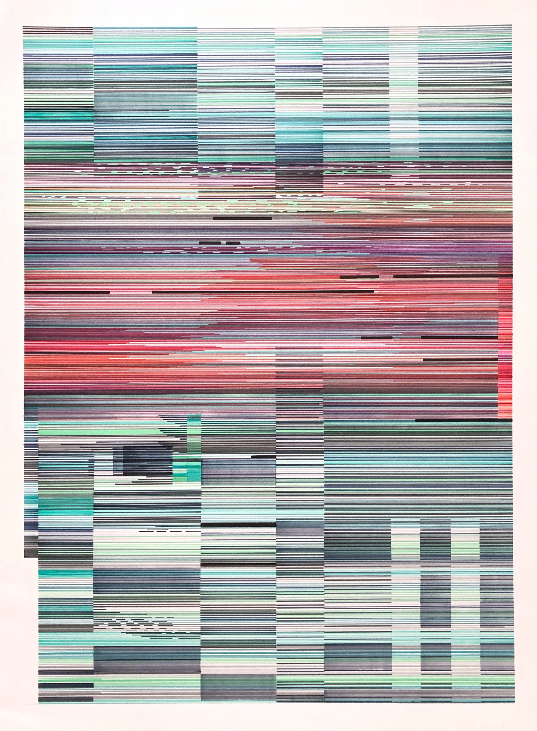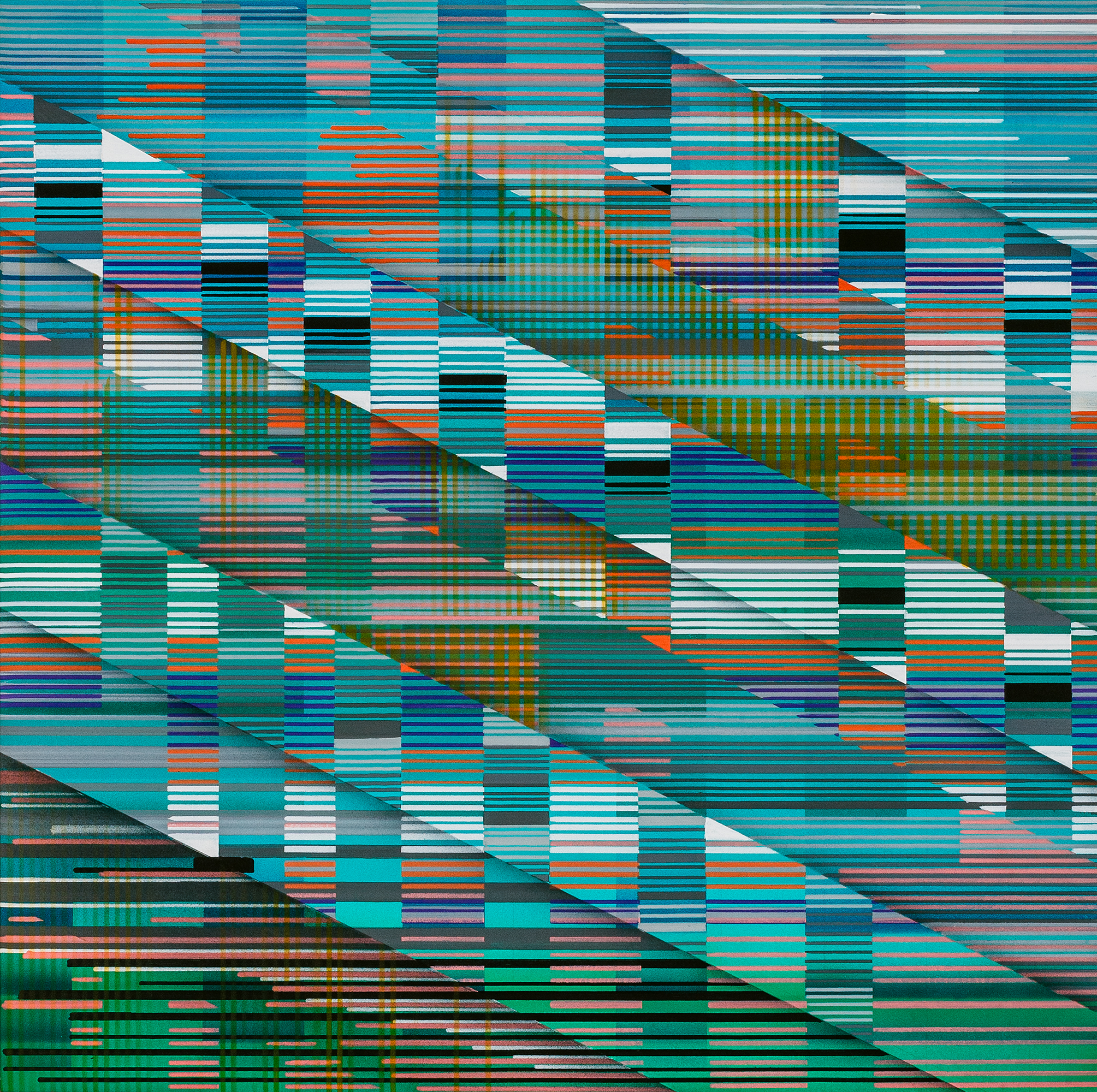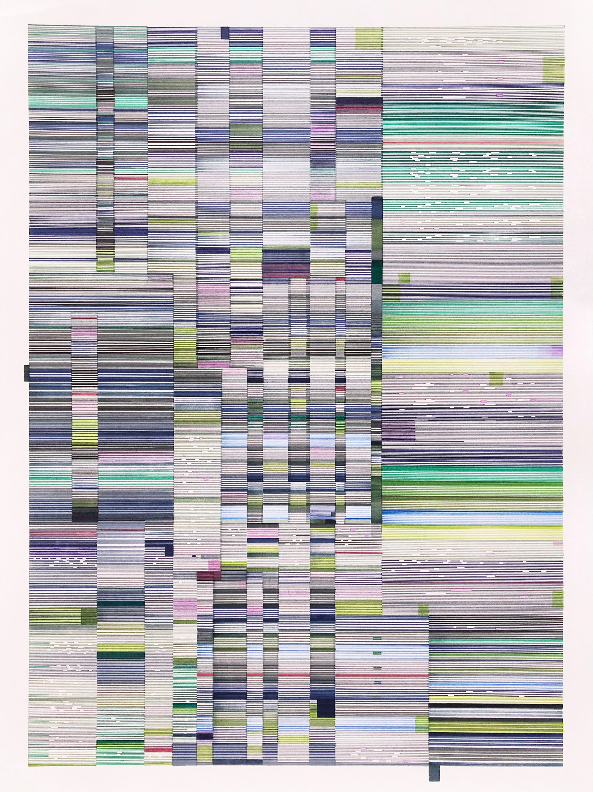 The Interference series of paintings & drawings explore the relationship between abstraction, human labor, machine logic, and perception in an increasingly screen-saturated world. These abstract artworks are grounded in a durational, meditative methodology in which repetitive mark-making functions simultaneously as gesture, discipline, and data. Through the incremental layering of translucent acrylic paint washes and accumulations of line-work created with brushes, paint markers, and calligraphy pens, these paintings enact a logic of emergence, where structure arises through repetition rather than predetermined design.