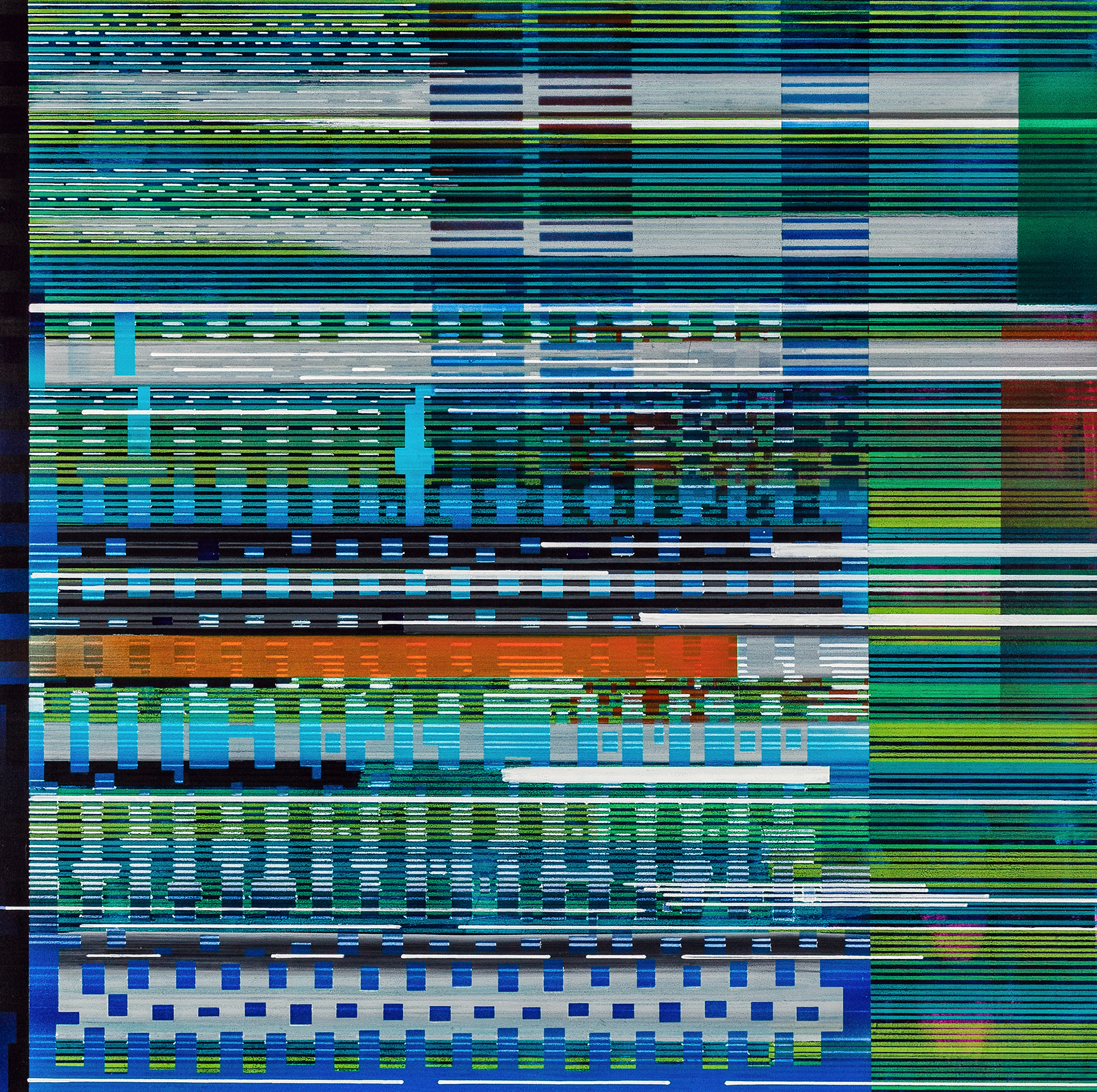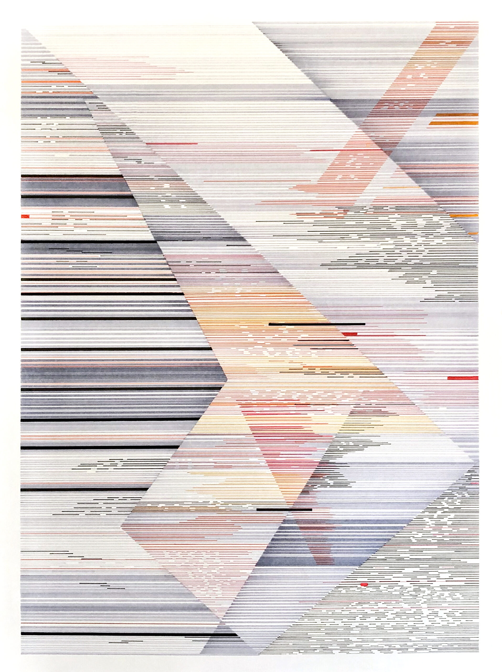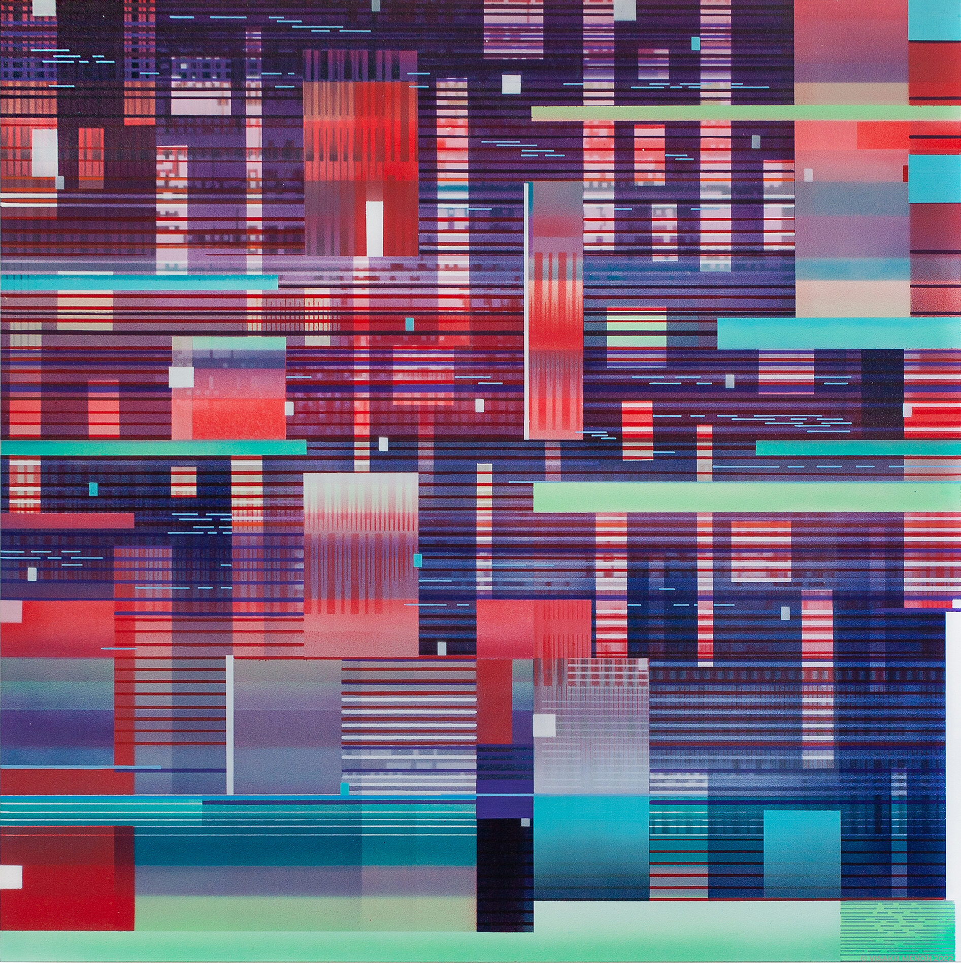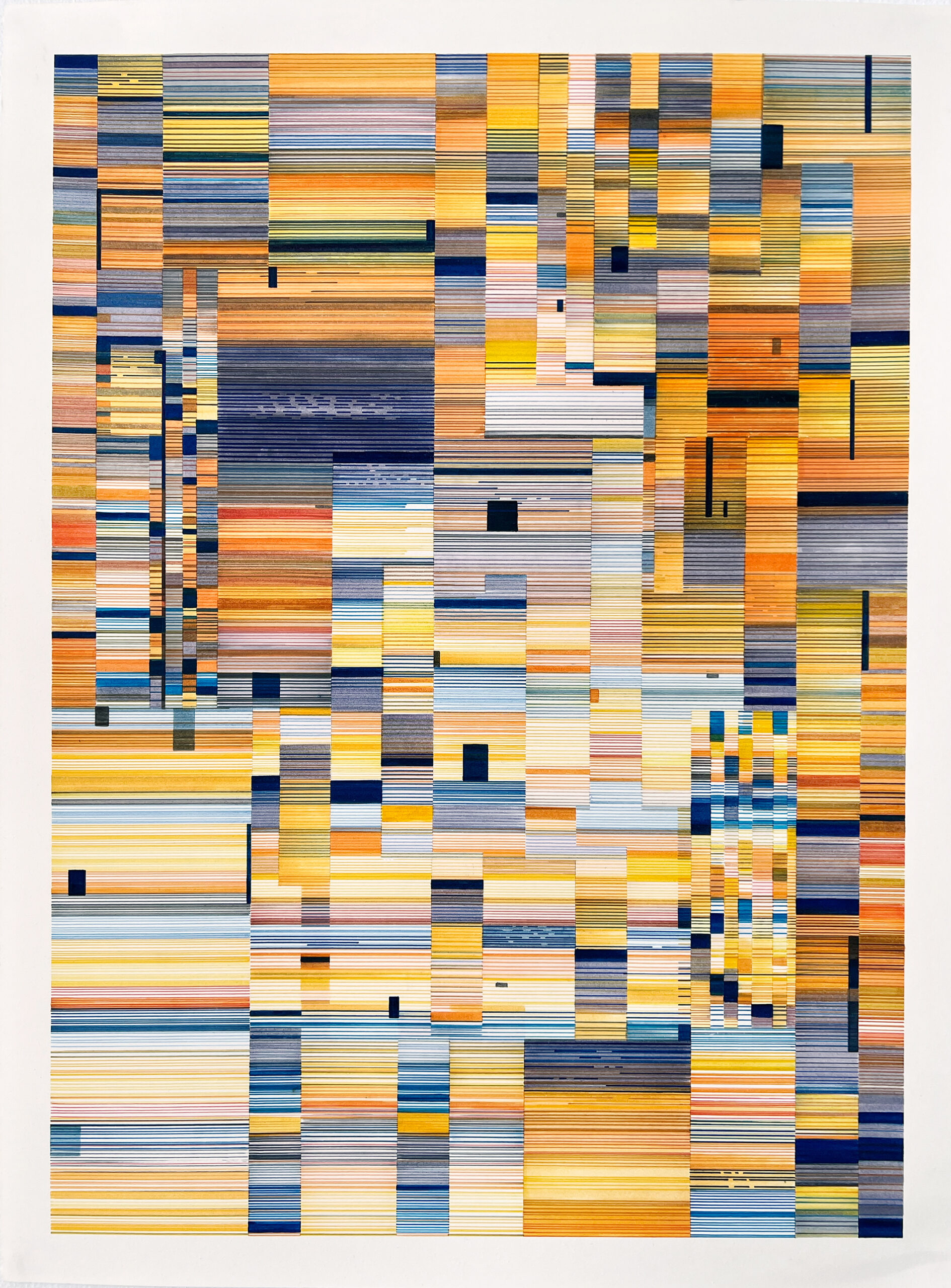 The Interference series of paintings & drawings explore the relationship between abstraction, human labor, machine logic, and perception in an increasingly screen-saturated world. These abstract artworks are grounded in a durational, meditative methodology in which repetitive mark-making functions simultaneously as gesture, discipline, and data. Through the incremental layering of translucent acrylic paint washes and accumulations of line-work created with brushes, paint markers, and calligraphy pens, these paintings enact a logic of emergence, where structure arises through repetition rather than predetermined design.