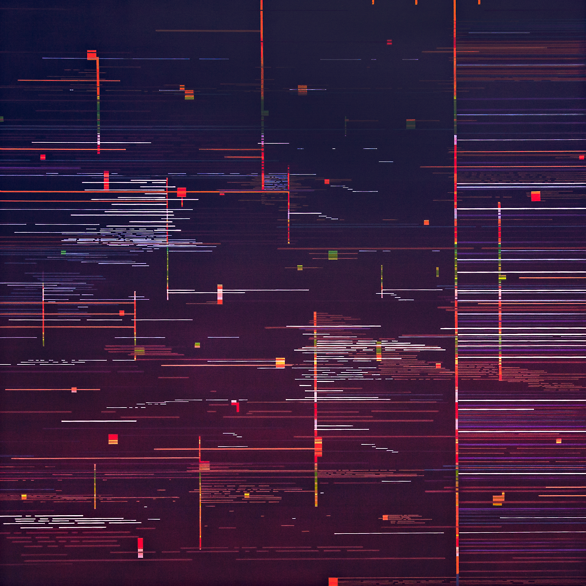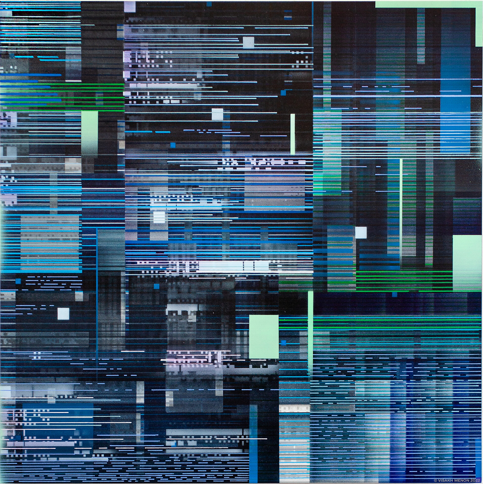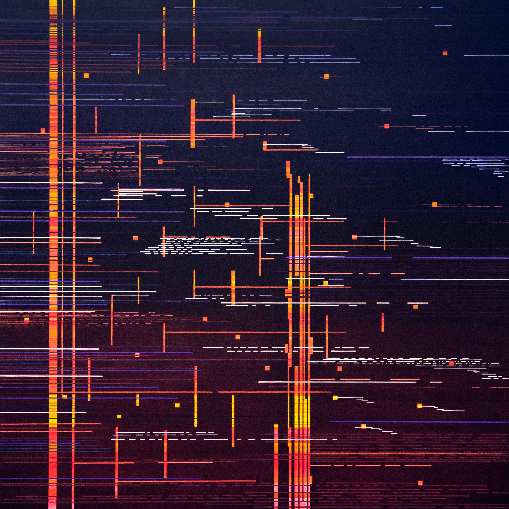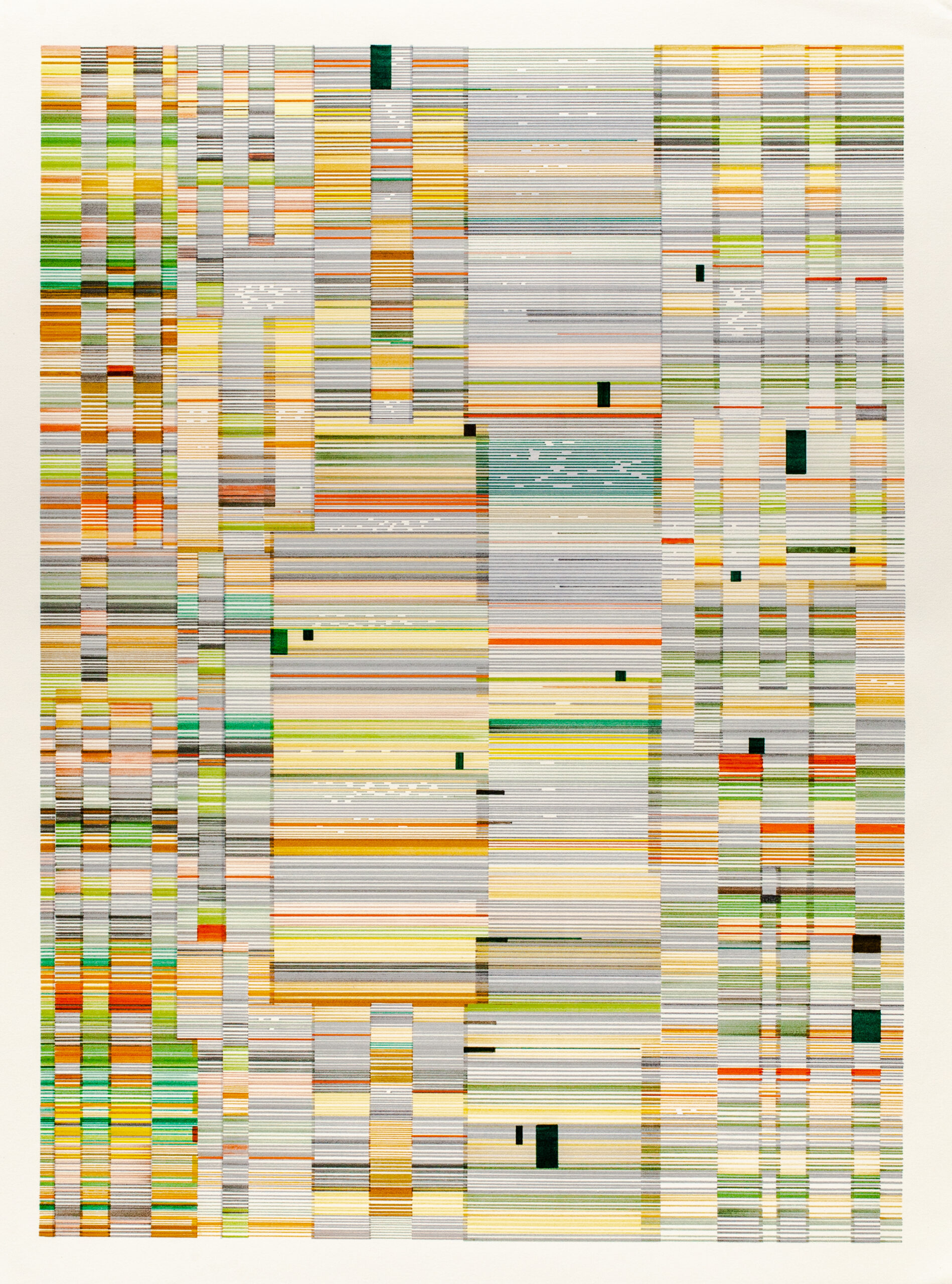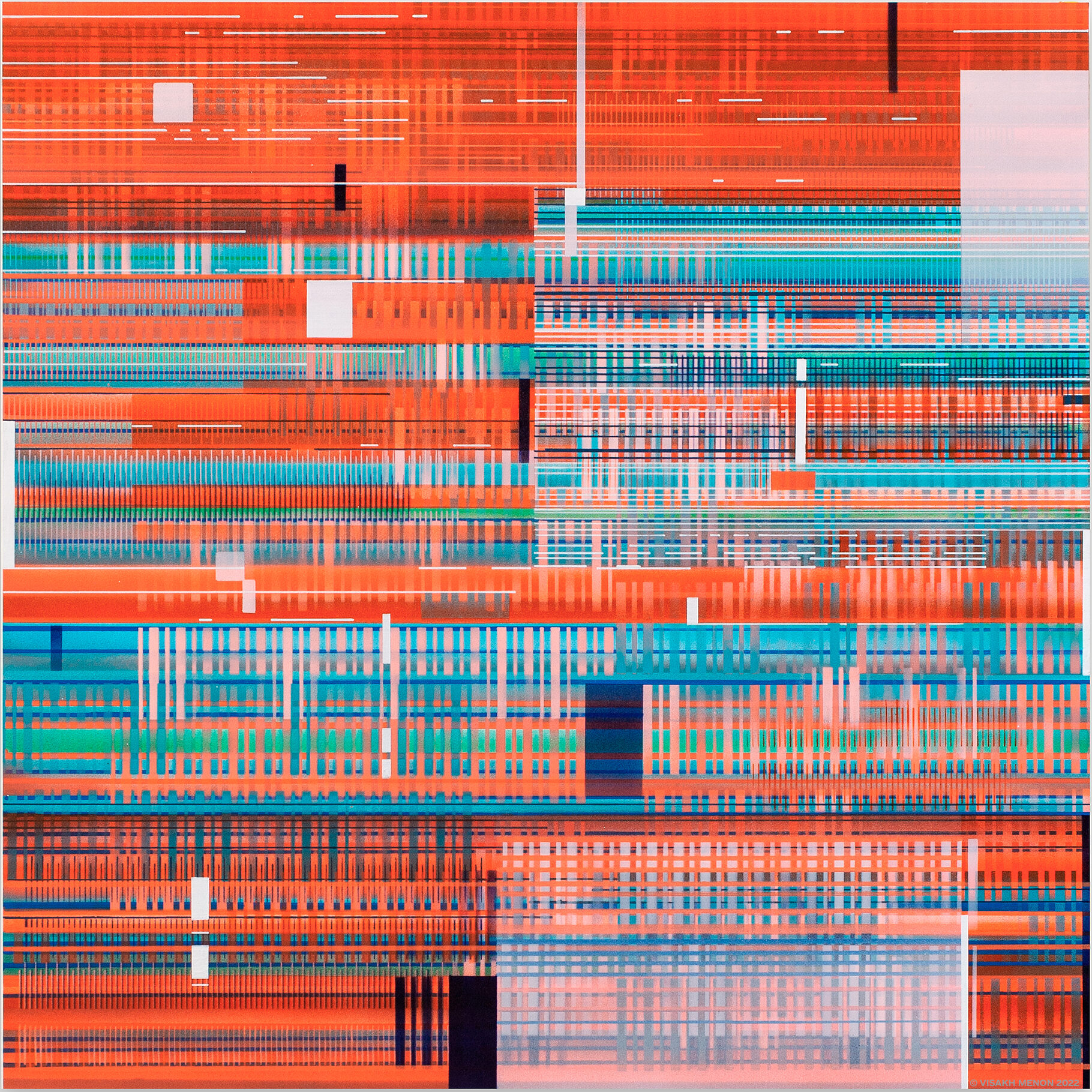 The Interference series of paintings & drawings explore the relationship between abstraction, human labor, machine logic, and perception in an increasingly screen-saturated world. These abstract artworks are grounded in a durational, meditative methodology in which repetitive mark-making functions simultaneously as gesture, discipline, and data. Through the incremental layering of translucent acrylic paint washes and accumulations of line-work created with brushes, paint markers, and calligraphy pens, these paintings enact a logic of emergence, where structure arises through repetition rather than predetermined design.